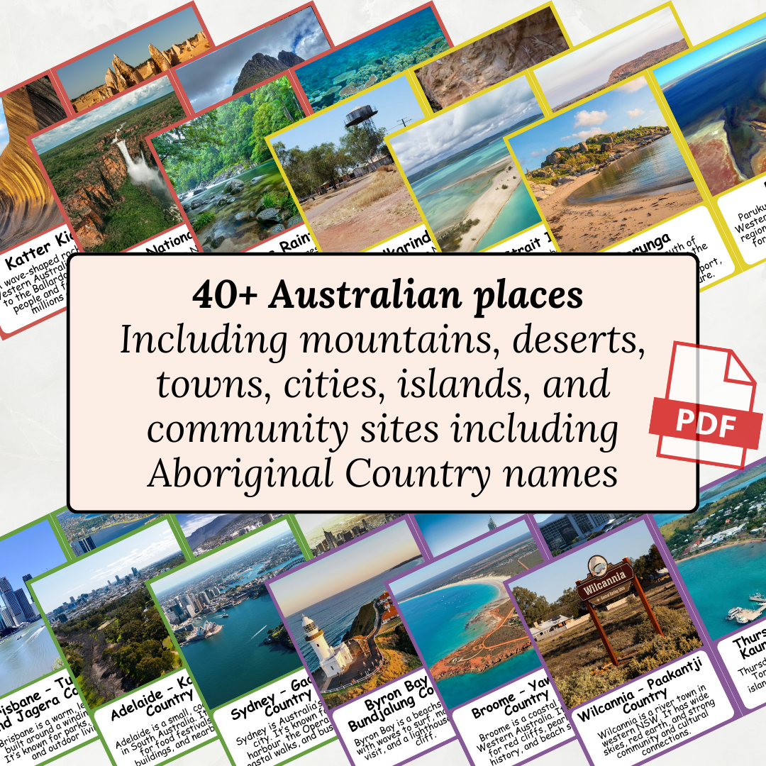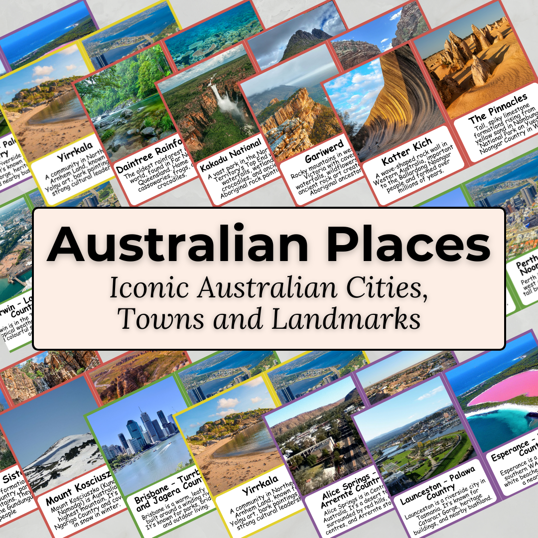 Explore the landscapes, cities, and communities that make Australia unique with this beautifully designed set of Australian Places Flashcards.