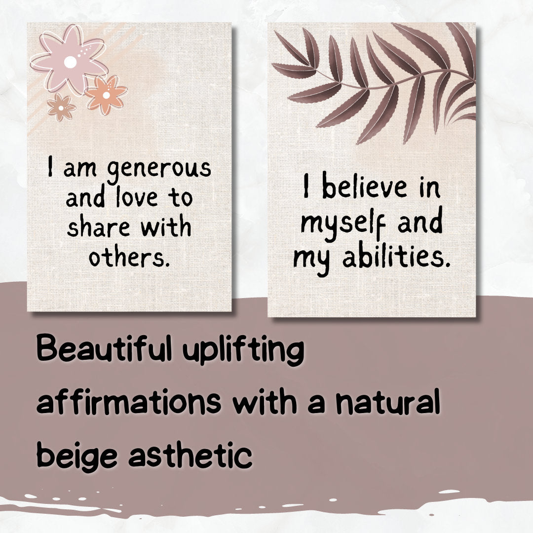 Introducing our Nature-inspired Affirmation Cards for Children - a delightful set of printable affirmation cards designed to embrace the calming and natural beauty of beige, brown, and earthy tones. Created with parents and educators in mind, these aesthetically pleasing cards offer a meaningful way to nurture positivity and confidence in young minds.