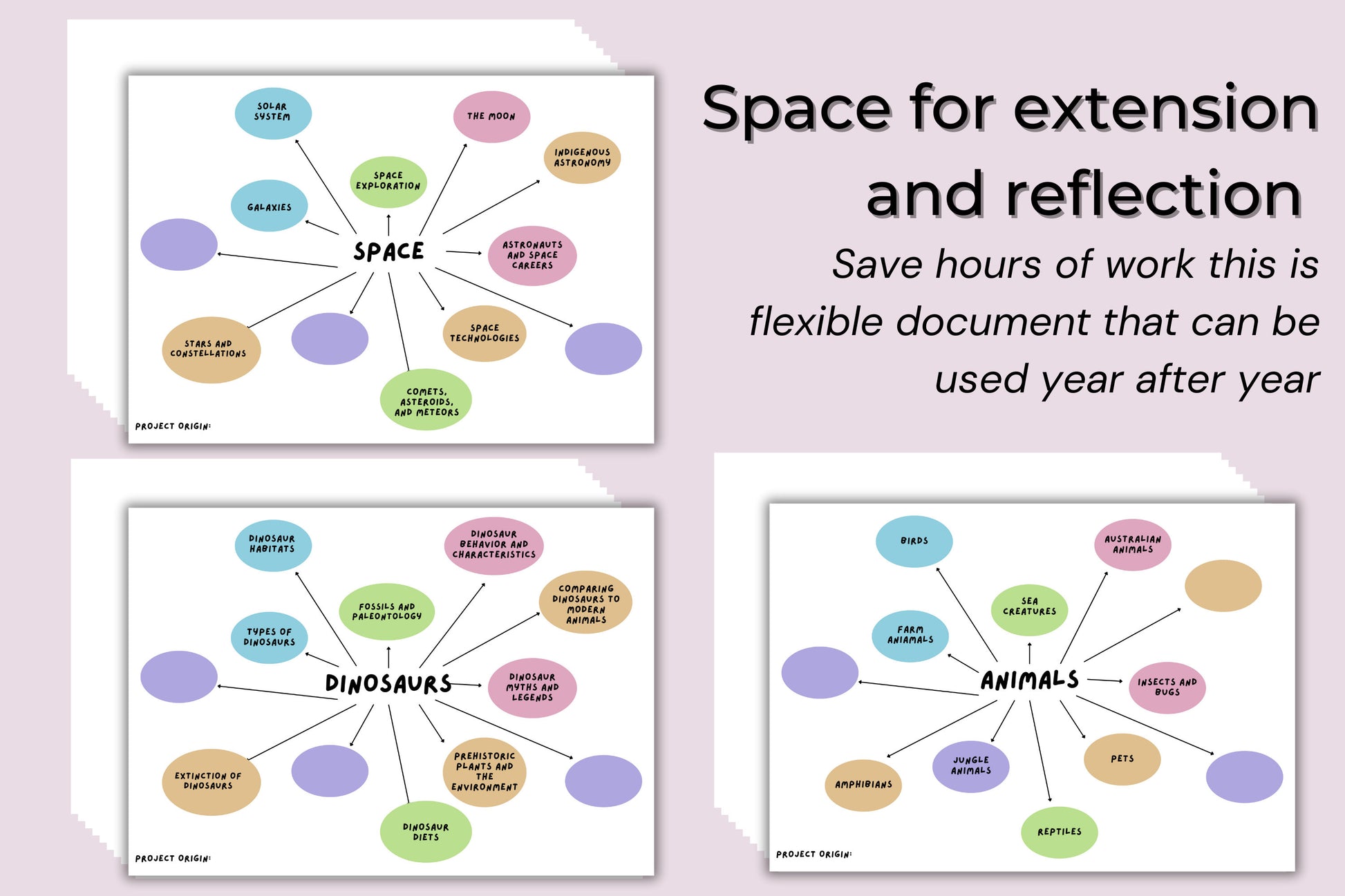 These templates cover six project topics: Dinosaurs, Animals, Weather, Space, Emotions, and Professions. With an emphasis on the Reggio Emilia approach, each mind map incorporates 10 subcategories with engaging and open-ended activity ideas, which are further categorised into language, motor skills, sensory, creativity, and social skills.