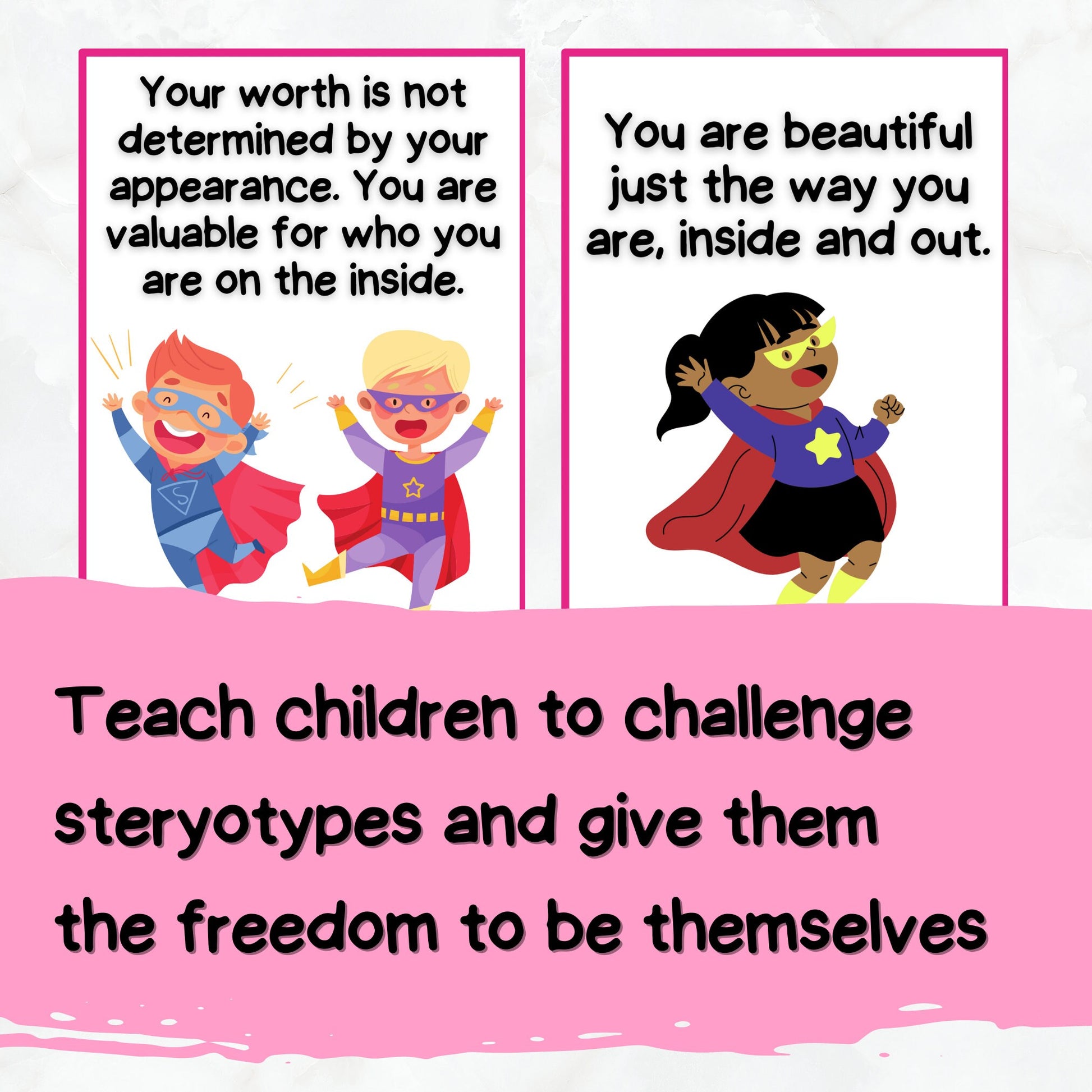 But that's not all! Complementing these stunning illustrations are impactful affirmations, meticulously designed to challenge societal stereotypes while fostering self-acceptance and empowerment. Each affirmation aims to nurture a child's sense of belonging, confidence, and resilience. This makes our digital product an ideal choice for parents, educators, and caregivers committed to fostering an empathetic and inclusive environment for children.