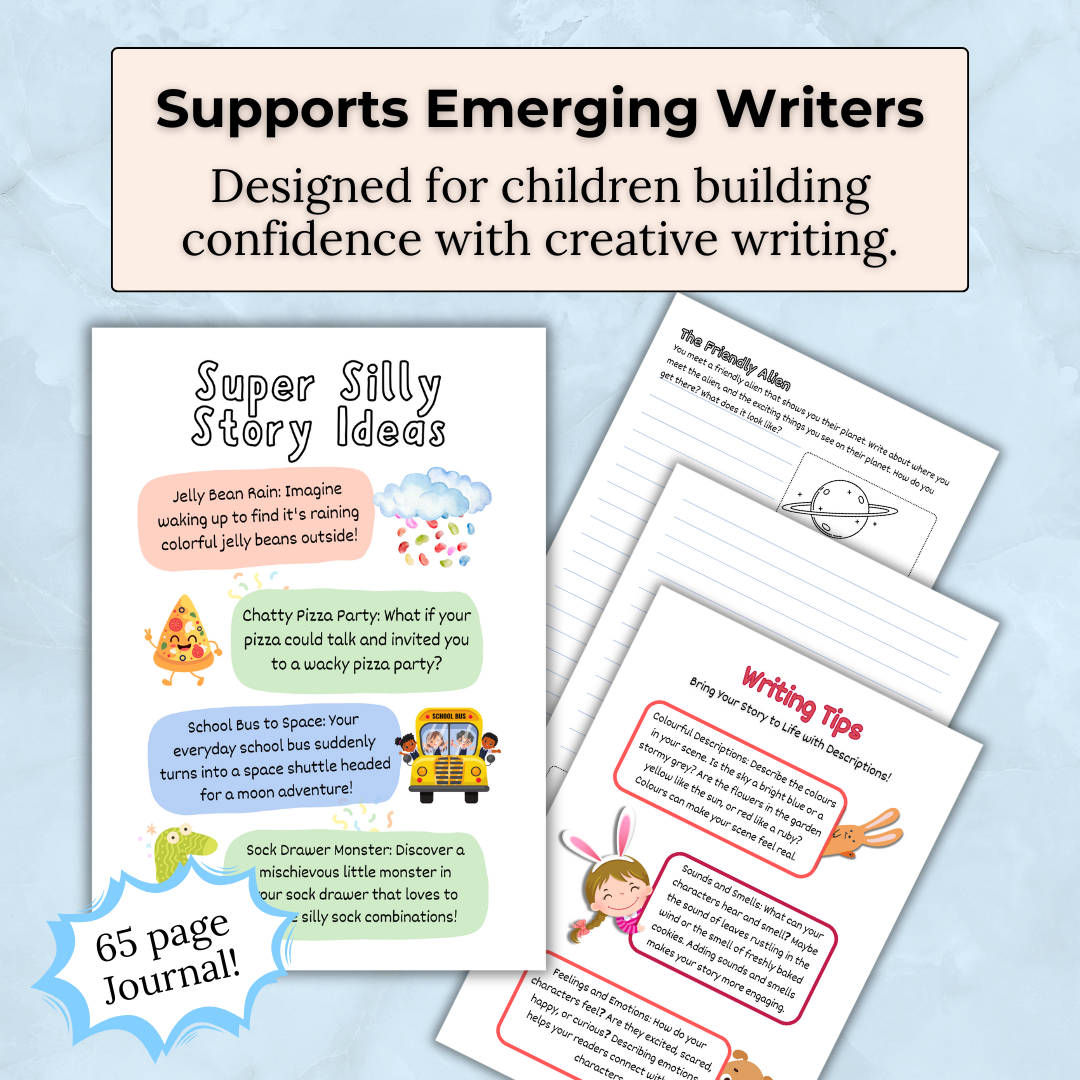 This journal combines guided story prompts, planning pages, and open-ended writing and drawing space, allowing children to move from supported writing to creating their own original stories.